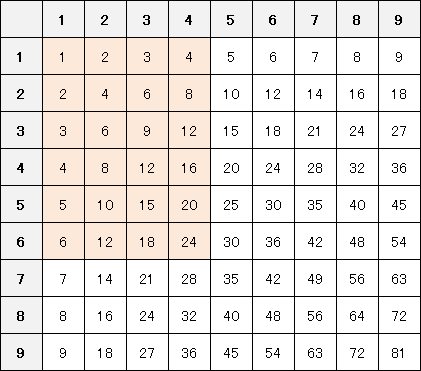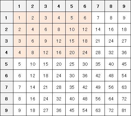 九九表で 4×6 のマスを長方形として塗ってみると、