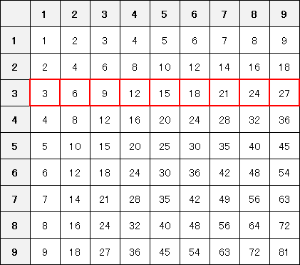 九九表の 横方向(たとえば3の段)を見てください。